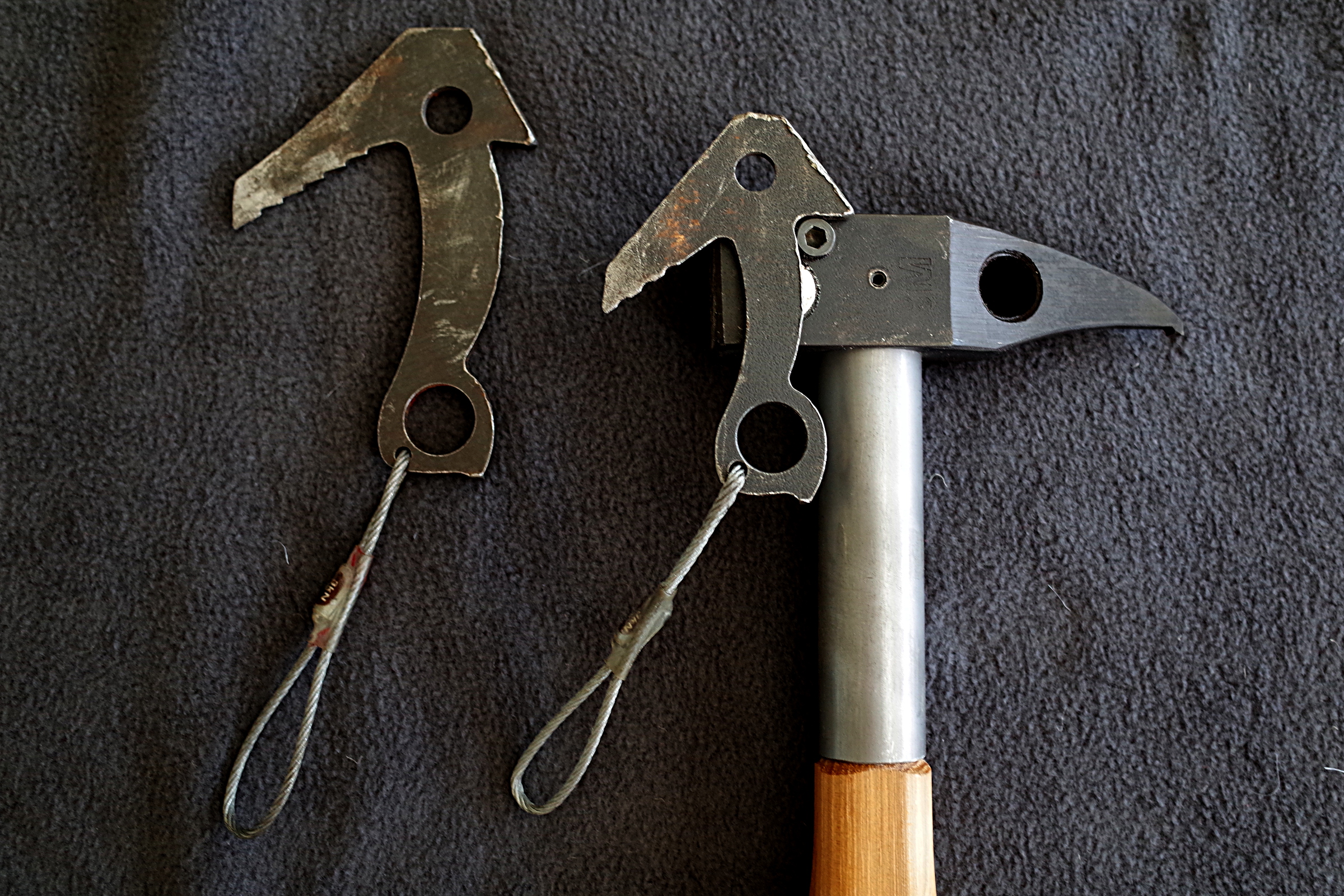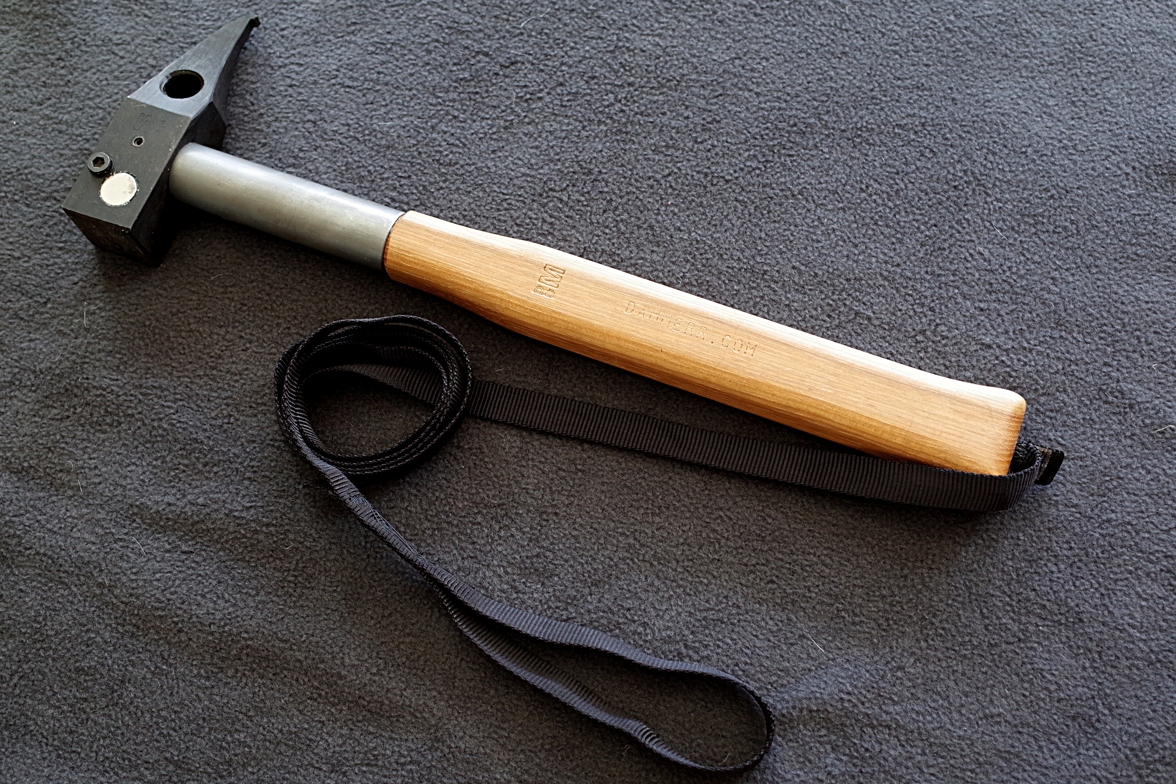 1) 15mm x 3mm neodymium magnets are set into each cheek of the hammer with epoxy. These are intended to reach and set gear. Primarily beaks such as BD Peckers, Moses Tomahawks and the like. A daisy or daisy/aider is attached to the beak before reaching, and that webbing is held with the same hand holding the hammer handle. Stick the piece to the magnet, reach up and insert, pull the hammer down to release and then hammer it in.