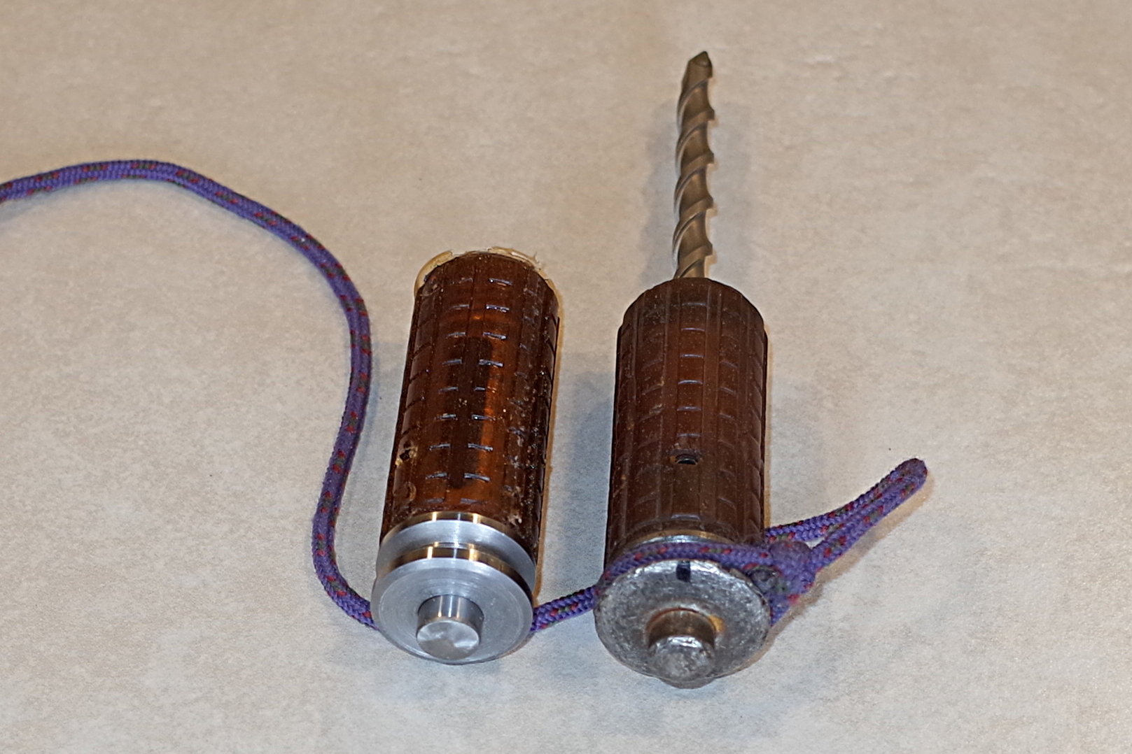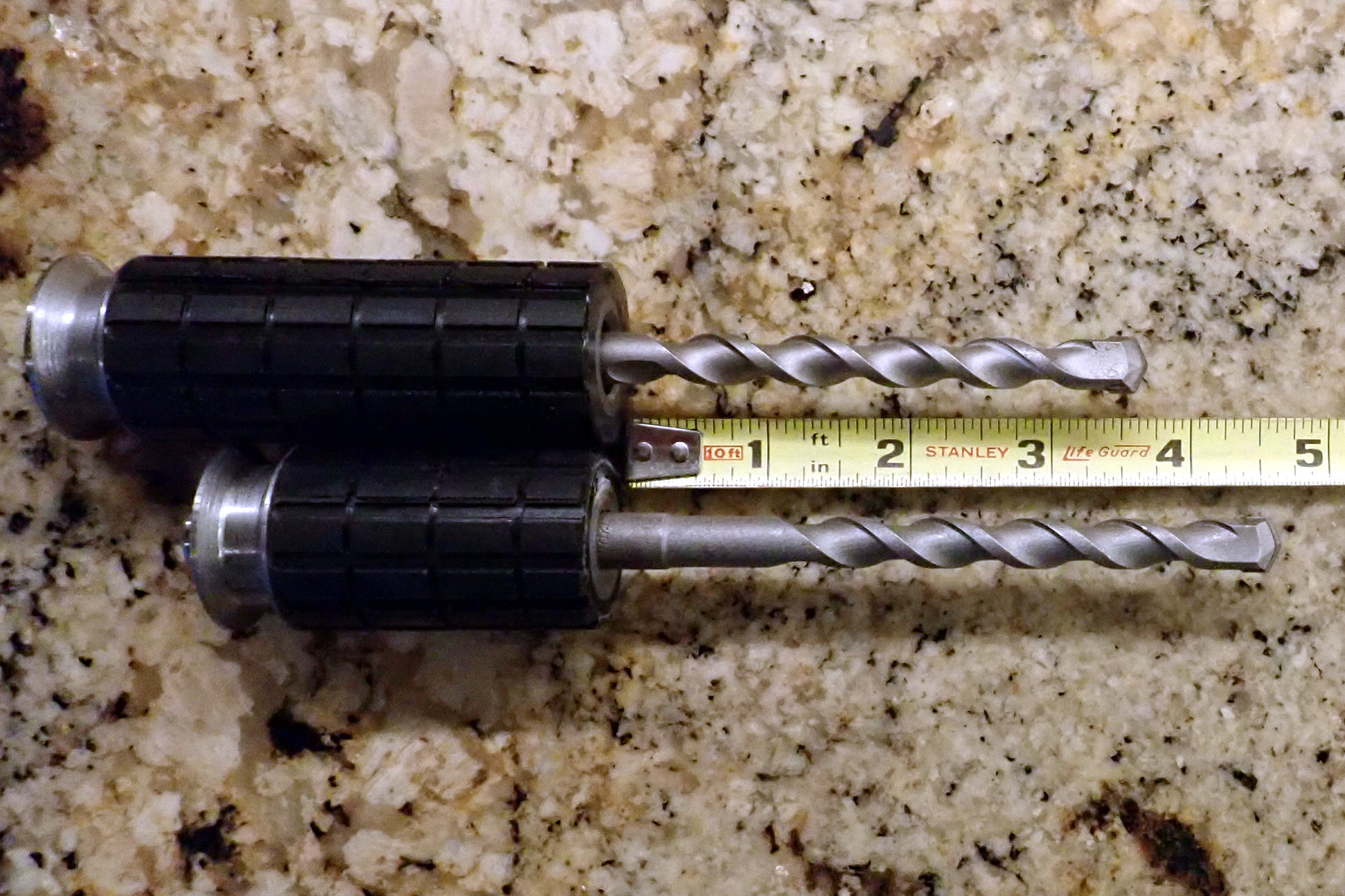 The type of drill holder that I make these days is called the bombproof because I tried to develop a holder that would last nearly forever. It is made from a high strength 7/8" bolt. Not only is the steel high strength, it is extremely tough which is apparent when I try to machine it. The bit is held in place by two set screws so one tool, an Allen wrench, is required to change bits. The grip is Shore 60A urethane that is cast in place and cannot be removed. It has an extremely hard steel striking surface - harder than the hammers. The socket is about 2.7 inches deep. I know of bombproof holder that have placed hundreds of bolts and are still going strong. I have several bombproof holders available.